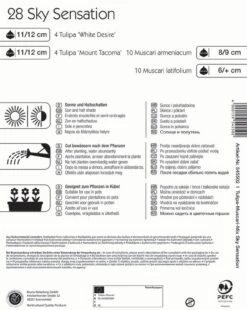 Die Blumenzwiebelmischung Colour Symphony „Sky Sensation“ ist zur Blütezeit wie ein Blick in den blau-weißen Himmel: Die gefüllten weißen Tulpen thronen wie Wolken über einem blauen Traubenhyazinthen-Blütenmeer – eine traumhafte Kombination für Beetflächen, aber auch für Kästen und Kübel. Dabei erreichen die Traubenhyazinthen eine Wuchshöhe von ca. 15 cm und die Tulpen etwa 45 cm. Frühe und späte Sorten wechseln sich ab, sodass sich ein anhaltender Blütenflor in der Zeit von April bis Mai bildet. Die mehrjährigen Pflanzen mögen sonnige und halbschattige Standorte, wo sie auch leicht verwildern.