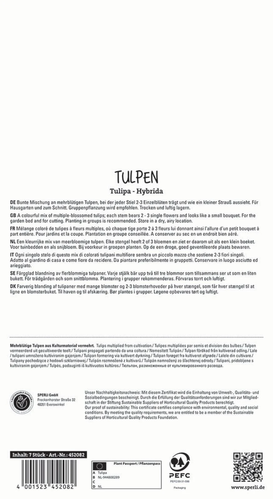 Bunte Mischung an mehrblütigen Tulpen, bei der jeder Stiel 2 – 3 Einzelblüten trägt und wie ein kleiner Strauß aussieht. Für Hausgarten und zum Schnitt. Gruppenpflanzung wird empfohlen.Trocken und luftig lagern.